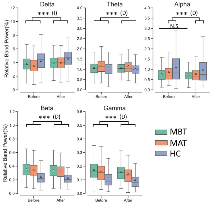 图4:干预前、干预后 和 HC 在顶叶与颞叶的相对功率谱