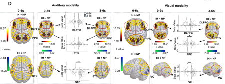 “先激活,后失活”的动态特征:在抑制的早期阶段(约0-3秒),额顶叶控制网络(DLPFC/PPC)被激活;而在后期阶段(约3-6秒),该网络的激活水平逐渐下降,同时感觉皮层(听觉/视觉皮层)的失活水平则进行性加深。抑制行为表现越好,感觉皮层的这种动态失活就越显著(图2)。