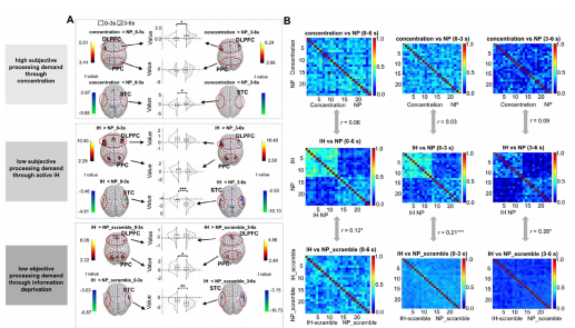 顺利获得对比主动抑制、主动专注以及被动信息剥夺(如听取杂乱音频、闭眼)三种状态,检验所发现的神经动态模式的特异性与普遍性。